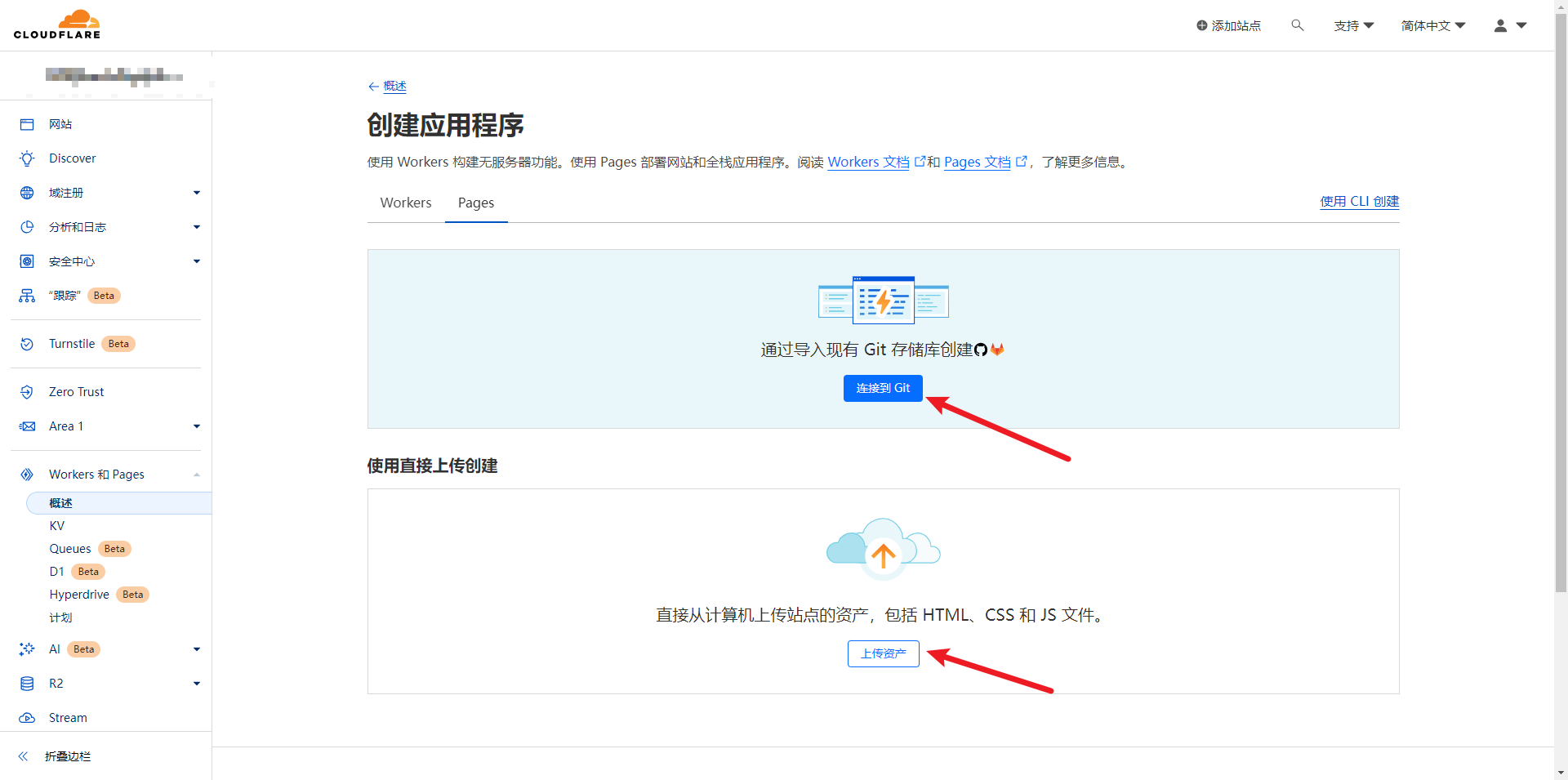 控制台主页面 Workers 和 Pages -> 创建应用程序 -> Pages