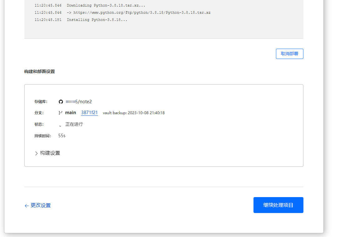 保存并部署,继续选择继续处理项目即可