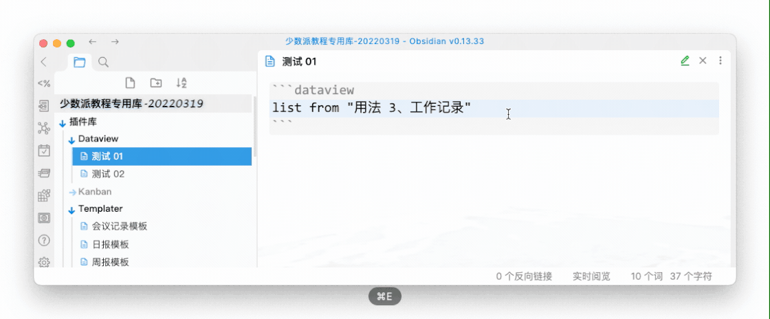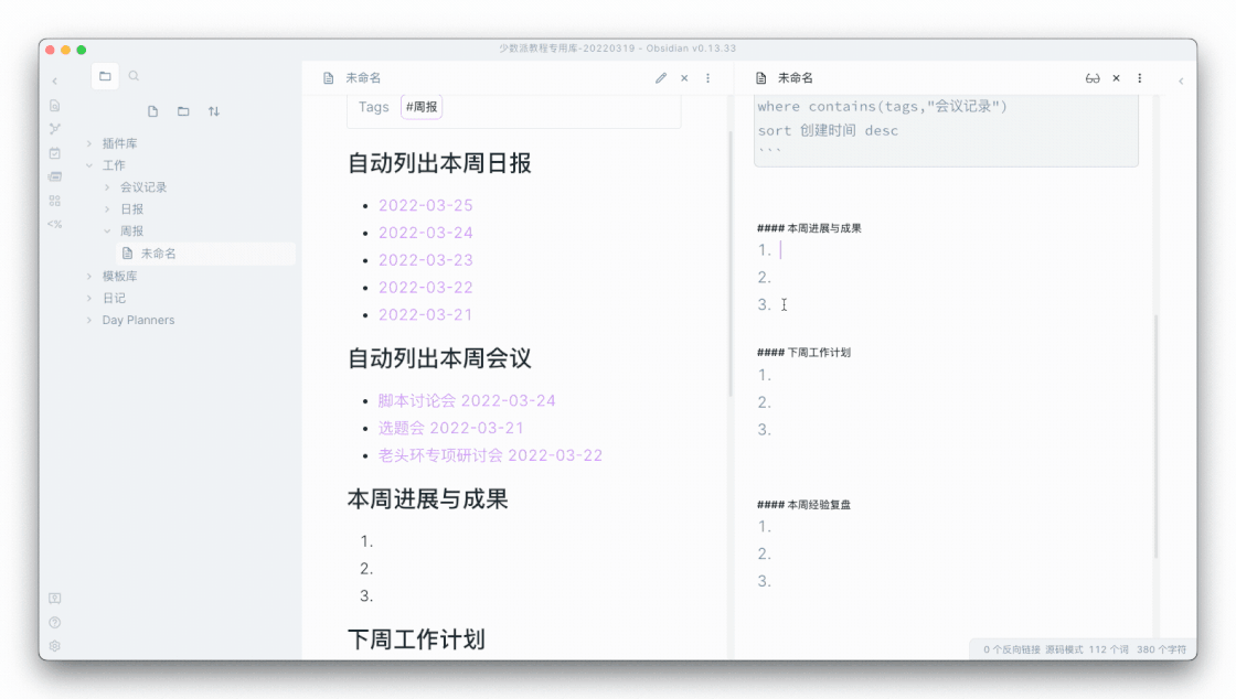 工作最让我感到厌烦的,不是工作本身具有难度,而是每周、甚至每天都得形式化地写又臭又长、根本没有人看的工作报告,于是我用下面两个插件来尽可能地减轻这种痛苦:用 Templater 插件来创建自动化的模板,以及使用 Dataview 插件来让 Obsidian 拥有高级检索能力。