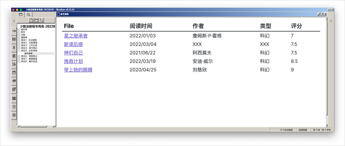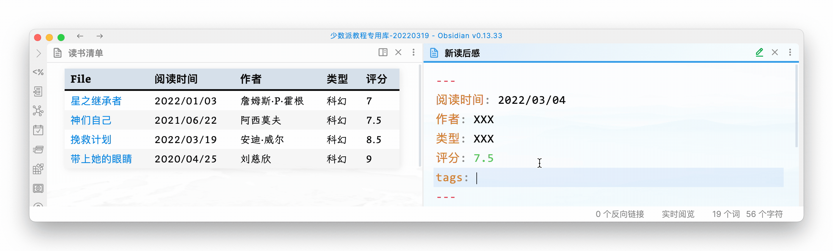 这个用法本质上还是 Dataview 插件的另一种应用, 与前面的清单(list)不同,这次我们要绘制的是一张可以动态变化的表格(table)。假设我们为 4 本书分别写了 4 篇读后感,并在文档的最开头用 YAML 语法进行一点配置(打标签)。
