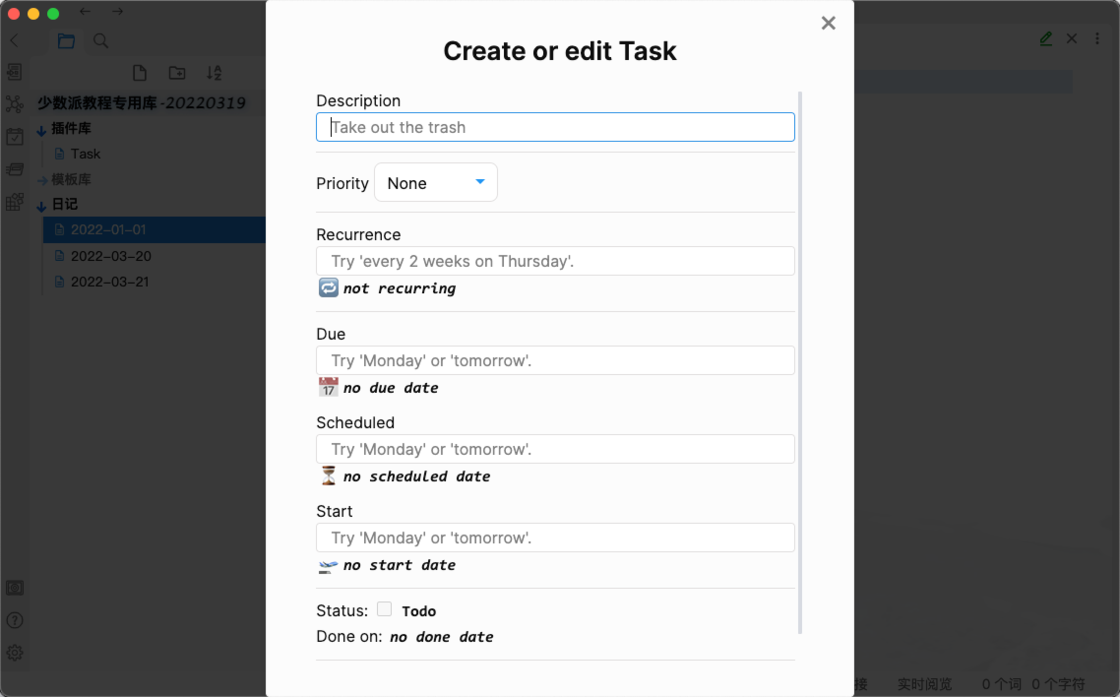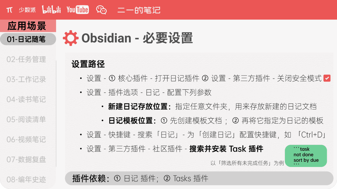 使用 Task 插件能用非常简单的语法,将分散于各篇日记的任务集中于一处管理,请在安装并启用 Task 插件后,执行如下操作