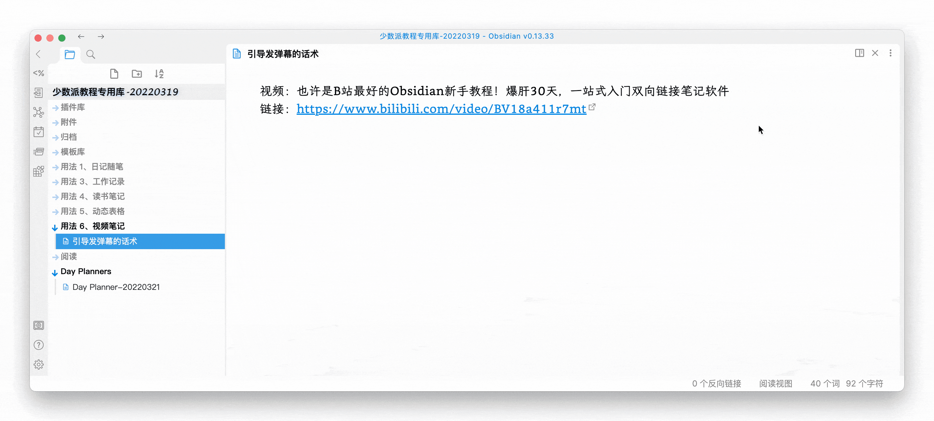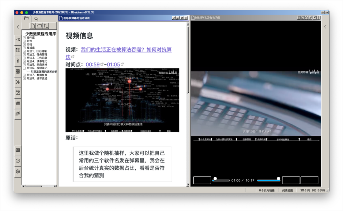 如上图所示,我会使用 Media Extended 和 Media Extended Bilibili Plugin,将笔记和视频界面并列来学习其他 UP 主的视频。(如果这个插件无法正常启动,请先关闭 Annotator 这个插件,重启 Obsidian,再尝试启用。)