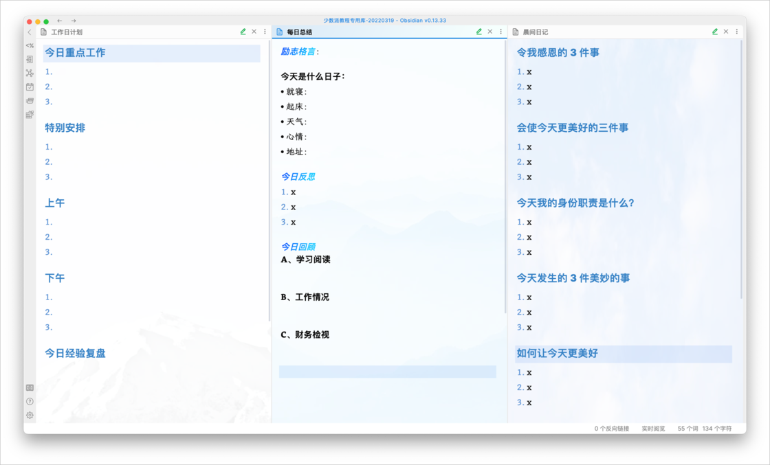 一般来说我更习惯于用无序列表来让记录这件事更纯粹一点,模板对我来说会有填空的压力。但你也可以事先设置诸如晨间日记、每日工作等模板。