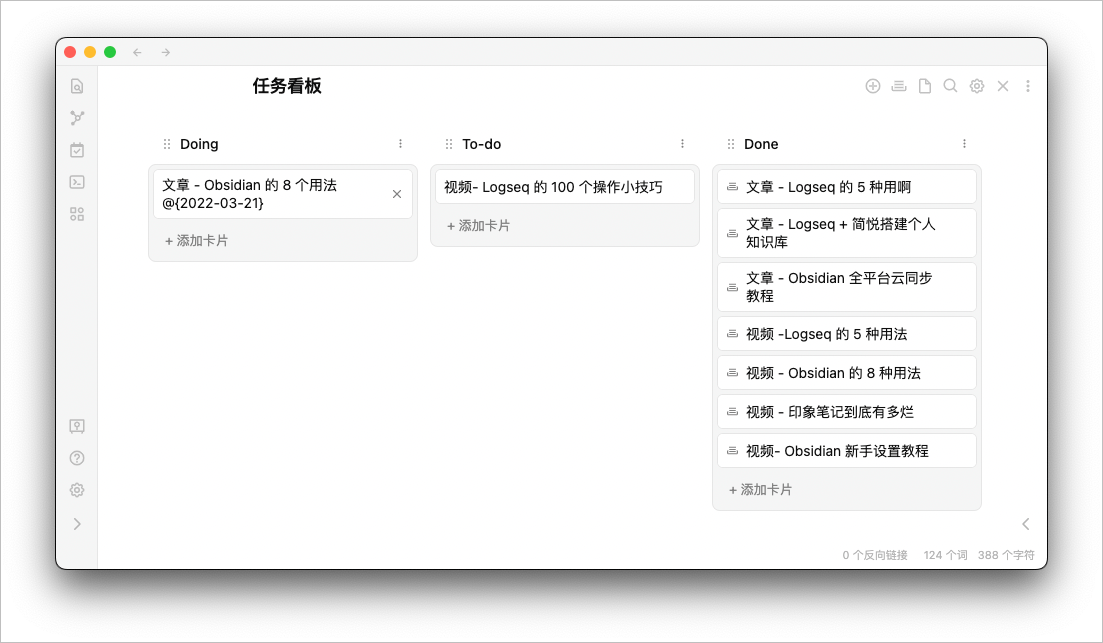 你可以像 Trello、Teambition、或者 Notion 中的 Board 面板 一样,去使用 Kanban 插件,它在常规看板的基础上,同样支持了双向链接功能,完整介绍你可以参考开发者这份文档