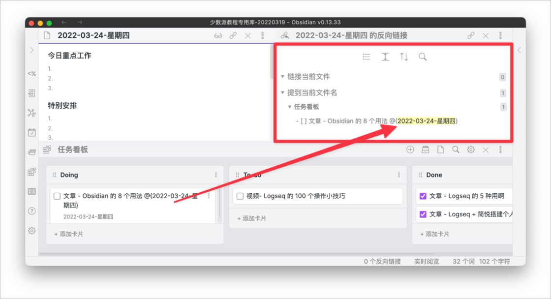 为看板卡片添加时间,例如 [[2022-03-24]],当那天到来时,你就能在 24 号日记的反向链接面板看到这张卡片: