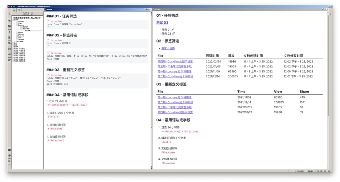 后面,我还会反复提到这个插件,你可以自行阅读 Dataview 插件开发者文档,学习更多高端操作,也可以点击下面大图,参考 Dataview 的部分语法。