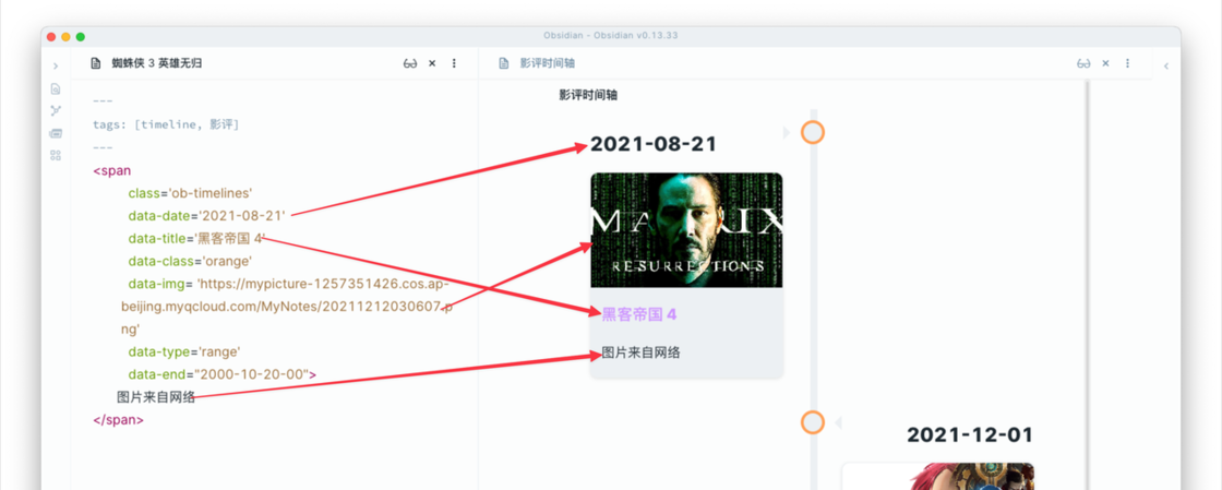 如果你直接复制上面的代码,记得自行修改一下引号内的内容。其中我们需要修改的部分有 datetitle 、以及 img 这三项,否则时间轴的时间、标题和封面将无法正确显示。