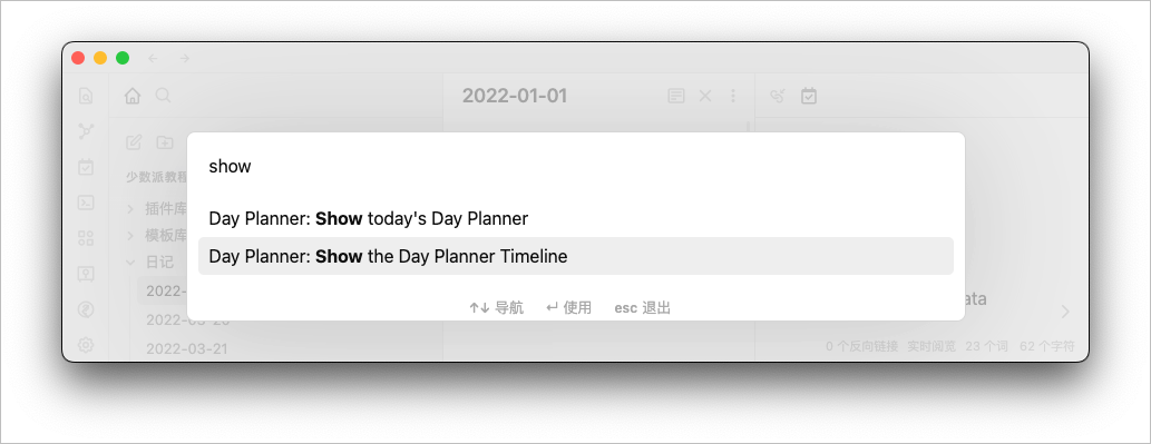 在插件设置中,将 File mode 切换到 Command mode,能够让你在任意一页文档中使用 Day Planner 插件,而无需创建额外的 Day Planner 文件夹。任务书写语法与 File mode 一样,但你还需要执行下面的操作: