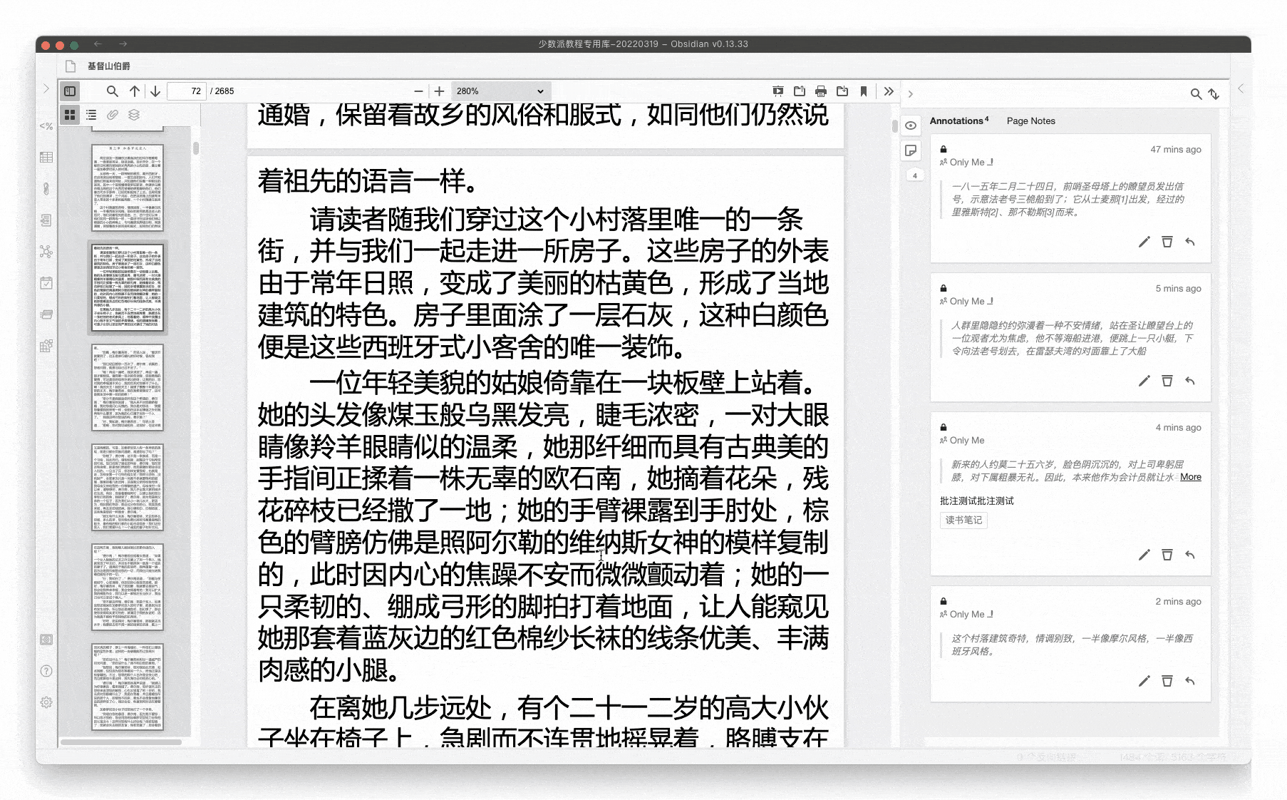 Obsidian 原生支持 PDF 阅读,你只需要将 PDF 文件拖到文件夹上即可载入,而安装 Annotator 插件 除了能让 Obsidian 额外支持阅读 EPUB 格式的文件,还能进行高亮、批注等操作。