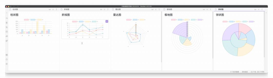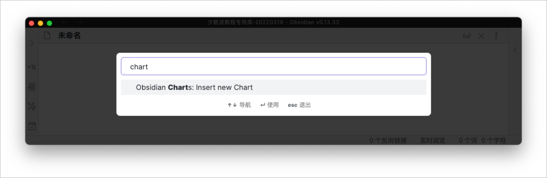 安装完插件后,使用 Ctrl+P 唤出命令菜单,然后搜索 charts 关键词,选择 Insert new Chart 即可,然后剩下的就是手动输入数据的基本操作了。