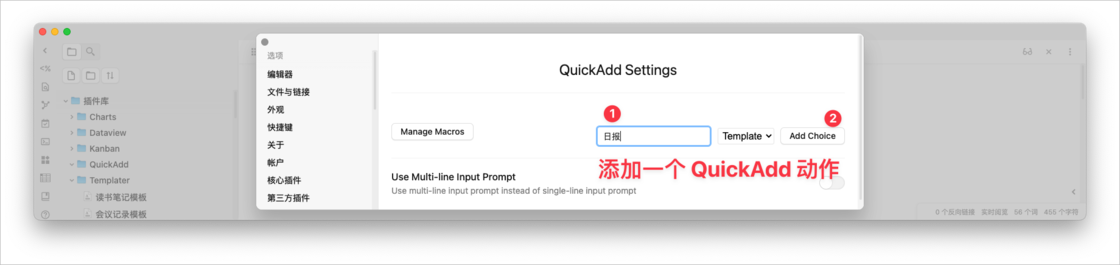 配置步骤上,首先,为 创建日报 添加一个 QuickAdd 动作: