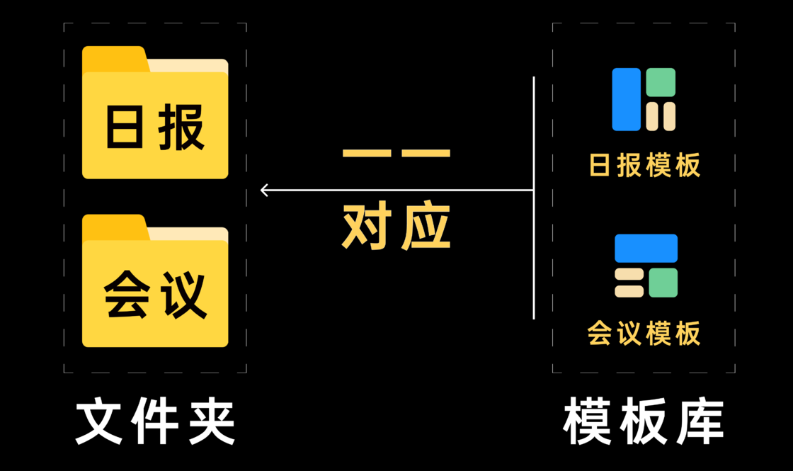 例如在「日报」文件夹创建文档则调用「日报」模板,在「会议」文件夹则调用「会议记录」模板,它比 Notion 的 Template button 更便捷,比 Logseq 的 Template 的自定义程度更高,比印象笔记要加载半个世纪的模板库更是不知快到哪里去了。