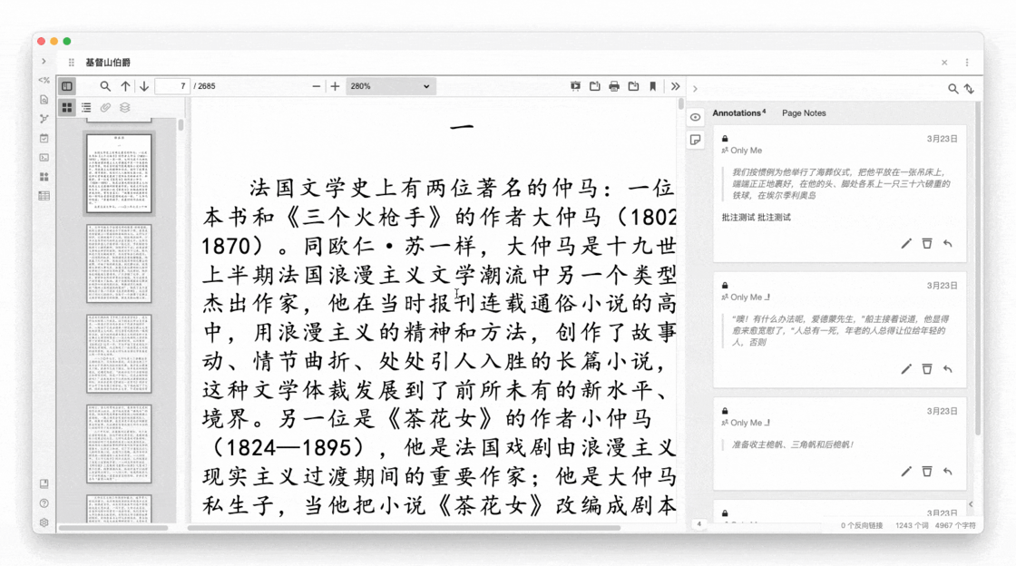 点击右上角的 Open as MD 关闭批注模式,然后进入阅读视图,你就能看到所有的高亮和批注都被搜集起来组成一篇文档了。