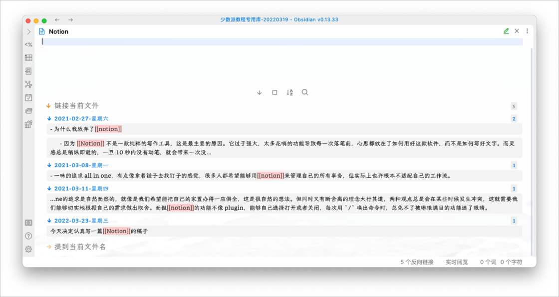 所以我们用 Daily Note 记录那些不成主题的碎片信息,直到你有明确的专项题目可以拓展,再通过反链面板去回溯过去在 Daily Note 中留下的碎片记录,有时候靠那不经意的一句吐槽都能带来无穷的启发。