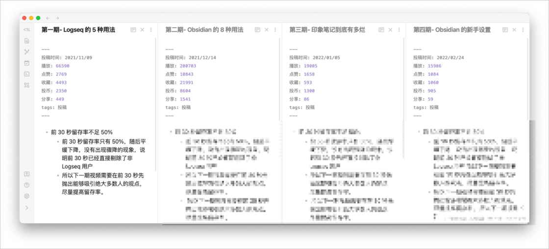 以我的 B 站投稿为例,我将视频数据放在 YAML 表头,然后在正文记录运营相关的分析和复盘