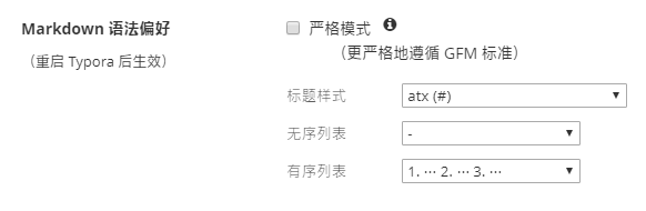 由于目前还没有一个权威机构对 Markdown 的语法进行规范,各应用厂商制作时遵循的 Markdown 语法也是不尽相同的。其中比较受到认可的是 GFM 标准,它是由著名代码托管网站 GitHub 所制定的。Typora 主要使用的也是 GFM 标准。同时,你还可以在 文件 - 偏好设置 - Markdown 语法偏好 - 严格模式 中将标准设置为「更严格地遵循 GFM 标准」。具体内容你可以在官方的 这篇文档 中查看。