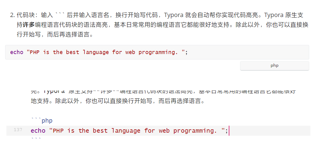 2. 代码块:输入 ````` 后并输入语言名,换行,开始写代码,Typora 就会自动帮你实现代码高亮。Typora 原生支持许多编程语言代码块的语法高亮,基本日常常用的编程语言它都能很好地支持。 除此以外,你也可以直接换行开始写,而后再选择语言。