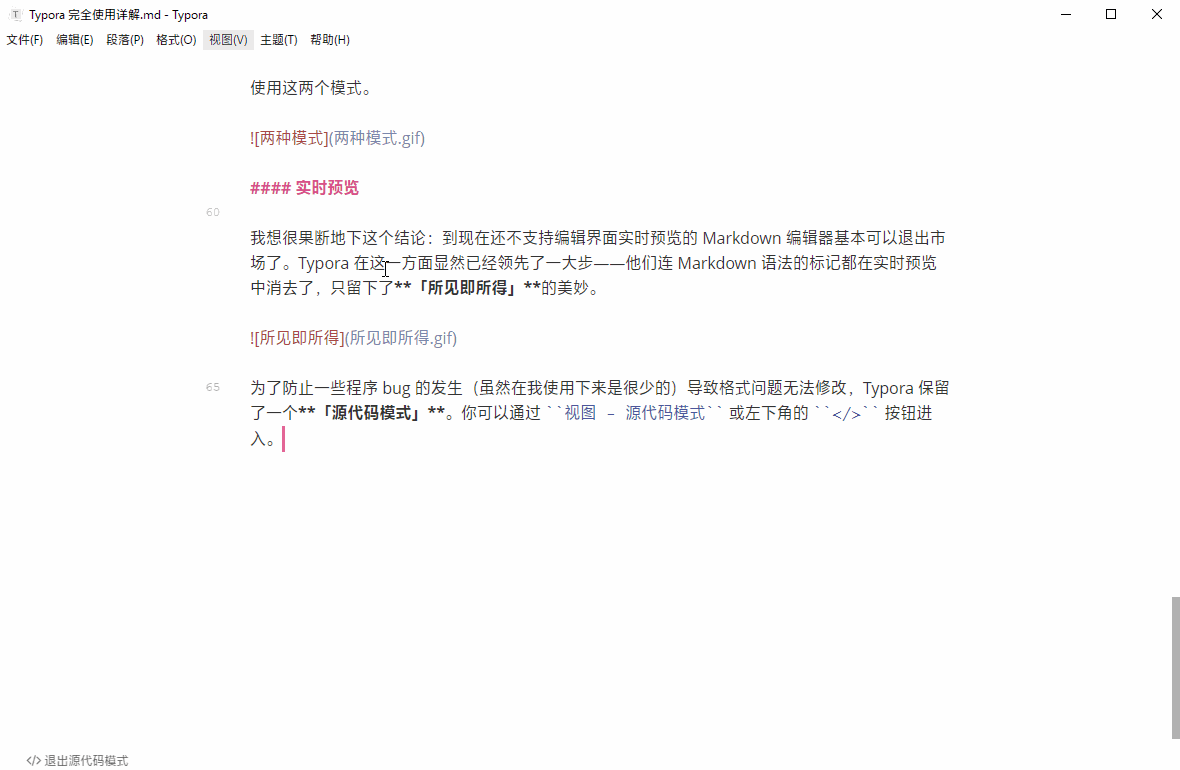 为了防止一些程序 bug 的发生(虽然在我使用下来感到是很少的)导致格式问题无法修改,Typora 保留了一个**「源代码模式」**。你可以通过 视图 - 源代码模式 或左下角的 </> 按钮进入。