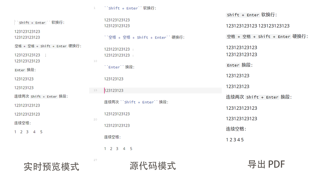 • **硬换行:**你可以通过 空格 + 空格 + Shift + Enter 完成一次硬换行,而这也是许多 Markdown 编辑器所原生支持的。硬换行在文档被导出时将被保留,且没有换段的段后距。