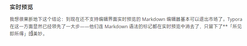 我想很果断地下这个结论:到现在还不支持编辑界面实时预览的 Markdown 编辑器基本可以退出市场了。Typora 在这一方面显然已经领先了一大步——他们连 Markdown 语法的标记都在实时预览中消去了。当你离开正在编辑的有格式的文本段后,Typora 会自动隐藏 Markdown 标记,只留下**「所见即所得」**的美妙。他们把这称为 Hybrid View。