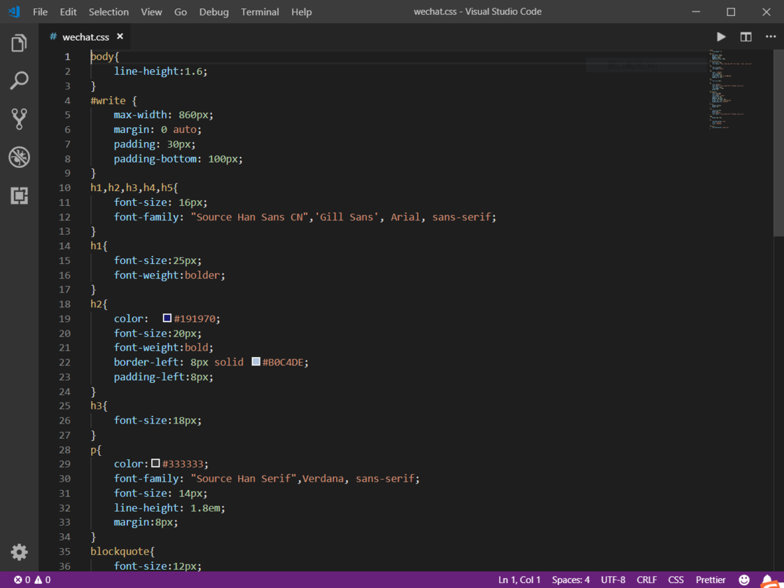 除此以外,如果你有一定的 Web 编程基础,你当然也可以自己修改、新建适合你使用需求的 CSS 文件。我自己就写了一份名为 WeChat 的 CSS 文件,来符合我公众号特定的排版需求,例如正文是 15px,页边距是 8,小标题是 18px 等等。