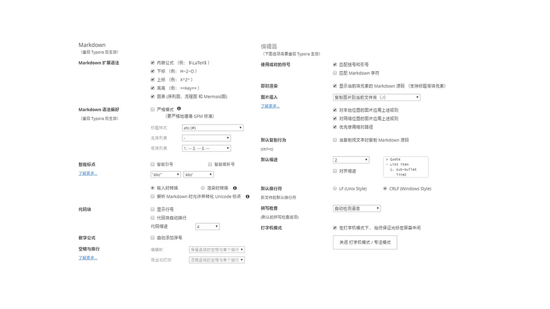 通过打开 文件 - 偏好设置 你会发现 Typora 为编辑体验的考虑细致到了令人叹为观止的程度。Typora 中提供了大量有关 Markdown 偏好的设置,据此,你可以构建一个几乎完全适合自己的 Markdown 编辑器。下面我将依次介绍一些与文本编辑体验有关的功能亮点。